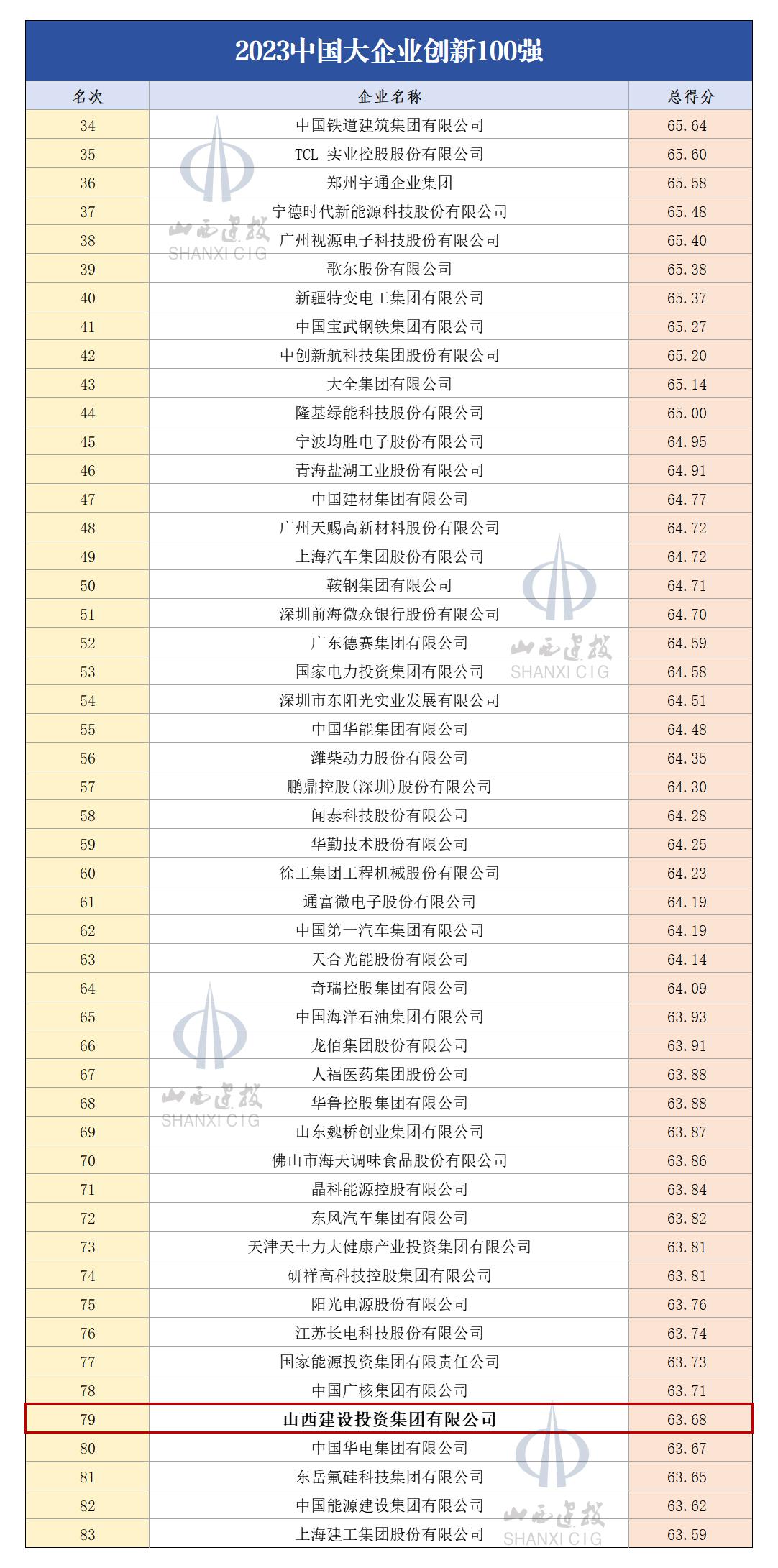中国企业联合会、中国企业家协会连续3年发布中国大企业创新100强。2023中国大企业创新100强是按照发明专利数、研发强度、营业收入的标准进行筛选,同时依据企业申报的研发费用、研发投入强度、拥有发明专利数、拥有专利数、收入利润率等数据,利用功效系数法计算得到各指标评价值,加权得到各企业综合评价得分值,最后按分值高低排序产生。