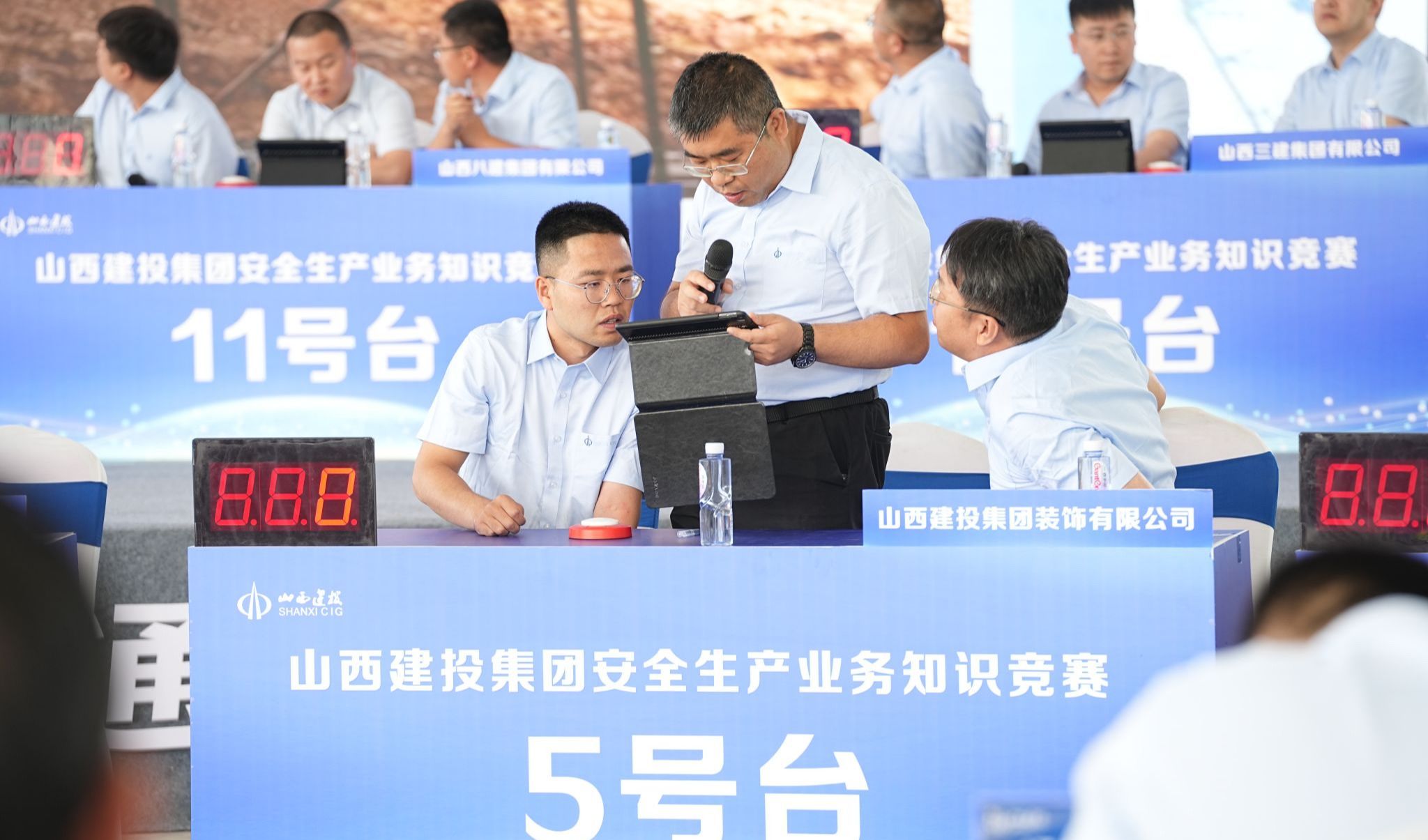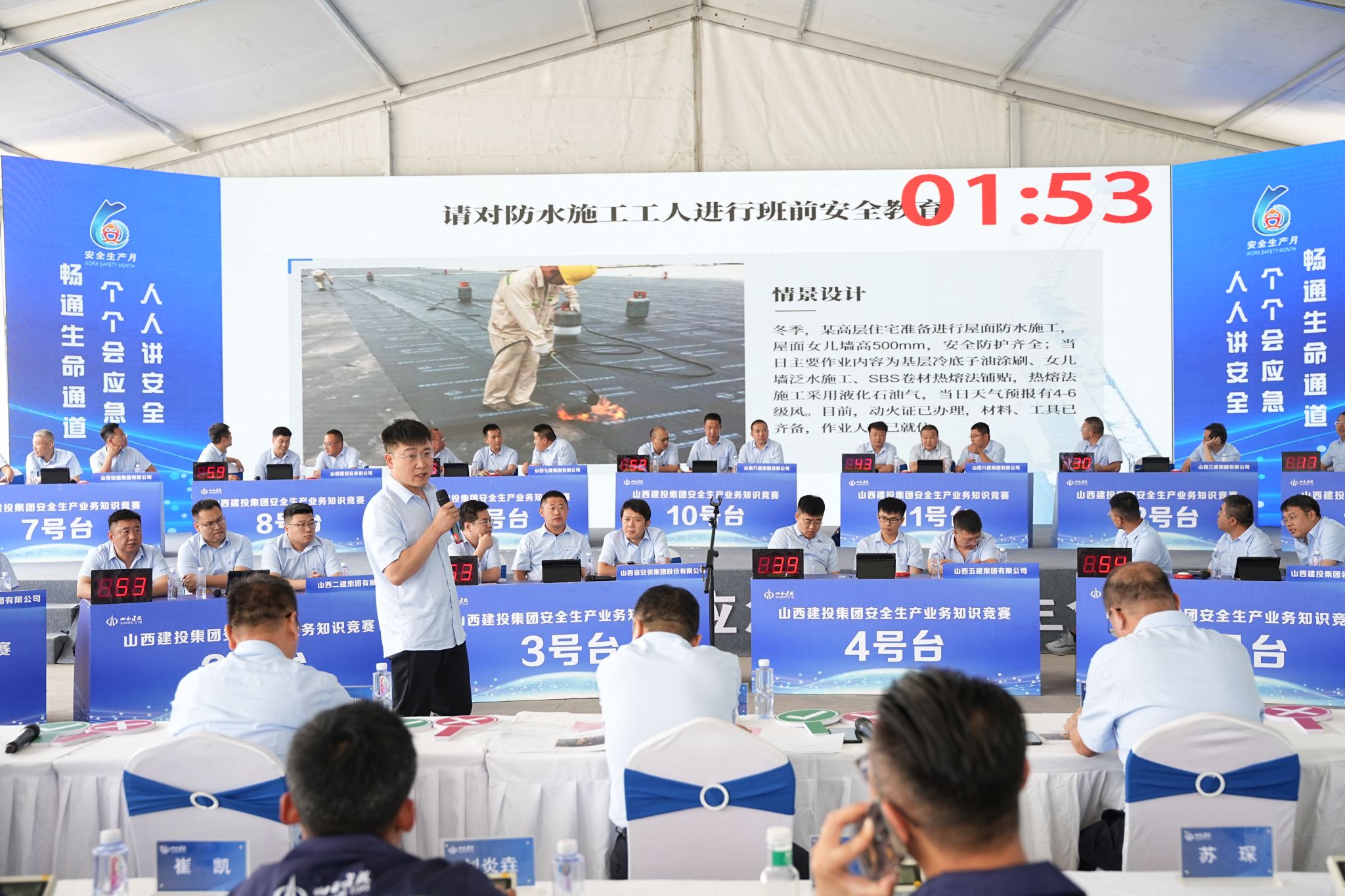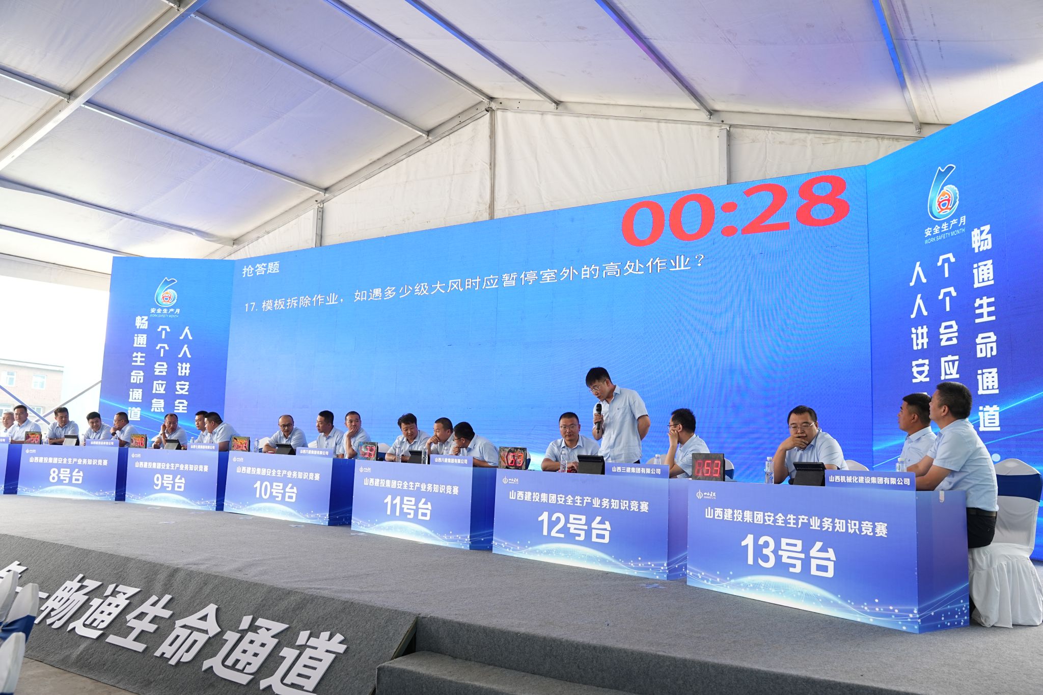 实践操练,安全入心。技能实操竞赛中,13支各由1名分公司经理、1名项目经理、1名项目专职安全员组成的企业代表队,在风险识别、班前教育和业务知识抢答三个比赛环节中展开精彩角逐。竞赛内容涵盖施工现场应知应会的基坑、脚手架、机械设备、高处作业、动火作业等危大工程、危险作业知识,充分考验了选手们的安全知识储备量及应对各类安全问题的思辨能力。