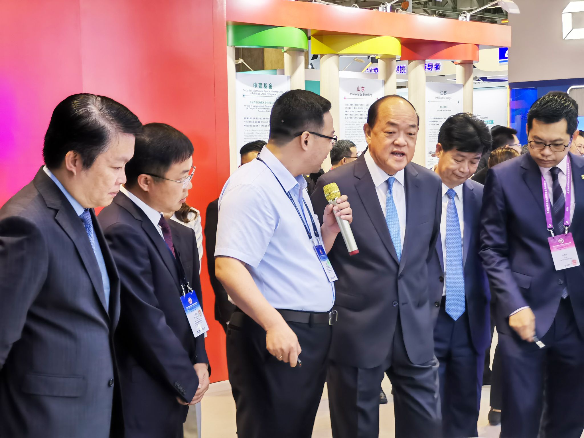 在展览过程中,澳门特别行政区行政长官贺一诚一行来到企业展区参观。