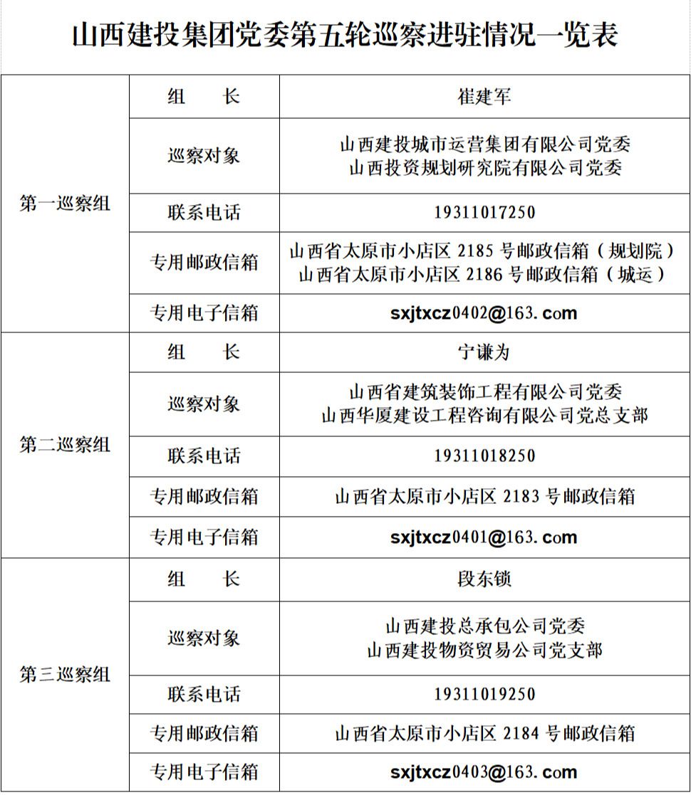 本轮巡察3个巡察组将在被巡察党组织进驻2个月左右,期间设立专门值班电话和邮政信箱,巡察组受理电话时间为工作日上午08:30—12:00,下午14:30—18:00。巡察组主要受理反映被巡察党组织领导班子及其成员、下一级党组织主要负责人和重点岗位负责人问题的来信来电来访,重点是关于违反政治纪律、组织纪律、廉洁纪律、群众纪律、工作纪律和生活纪律等方面的举报和反映。其他不属于巡察受理范围的问题反映,将按规定由有关部门处理。巡察组受理信访时间截止到2025年1月3日。