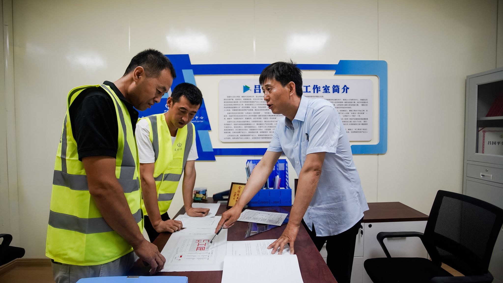 2022年,“吕国平劳模创新工作室”正式挂牌。他带领团队累计培养企业自有产业工人砌筑工200余人,50余名成员在各级各类技能竞赛中取得优异的成绩。经过反复试验,工作室发明了“一种加气块墙体后埋金属架体承载装置用临时支撑架”,极大提高了施工效率和安全性。此后,总结形成了“一种非黏土砖切割定位工具”“可调节勾缝深度、更换勾头的砌体勾缝工具”等多项“五小成果” 。这些凝聚着团队智慧的创新成果,为企业节省了大量人力成本和资源损耗,也让工作室成为行业创新的先锋。