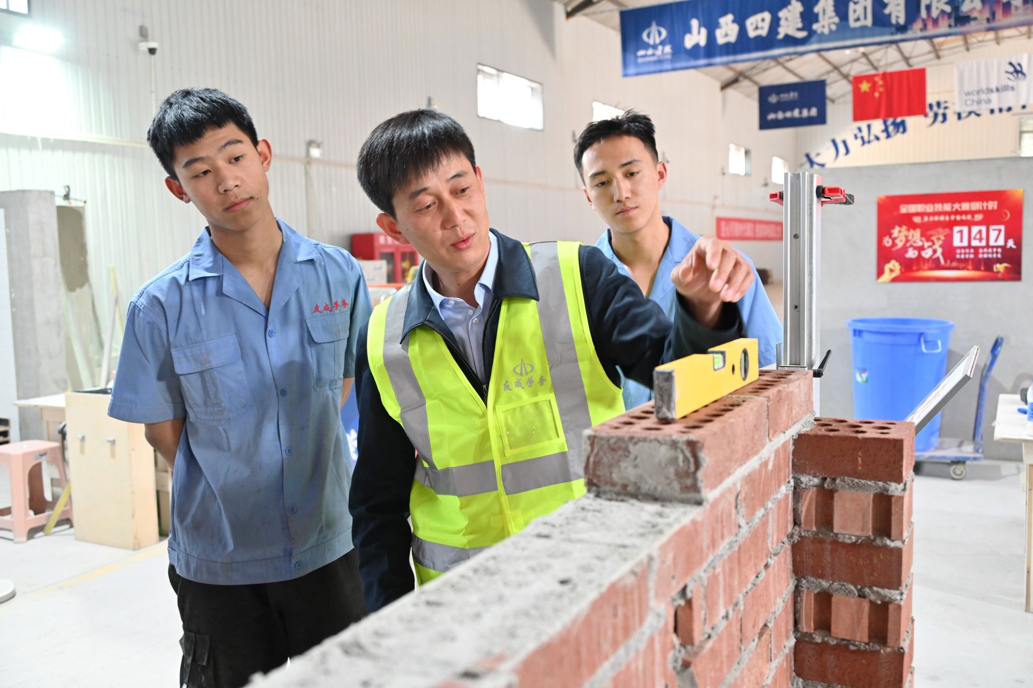 他同时还担任着四建集团职业技能提升管理中心的导师一职。实训楼里,“就业燃亮生活 劳动创造未来”的标语激荡人心,学员们正在分组练习砌筑、支模、镶贴等,备战今年9月份即将举行的中华人民共和国第三届职业技能大赛。一手持测量工具,一手抚过墙体上的复杂造型,吕国平告诉学员:“砌筑的时候一定要注重细节。看,这几块砖的块拼接不够流畅,圆弧要慢慢地磨,稍有差池就高低不平,影响整体效果。”