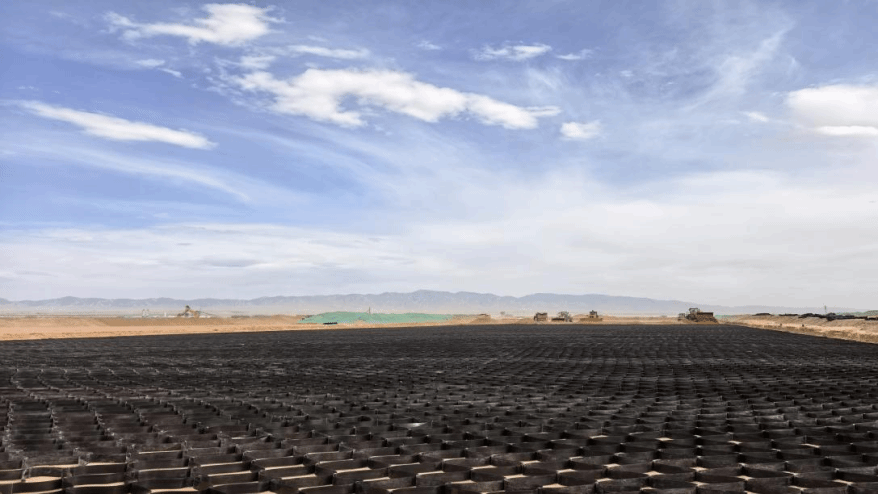 面对这一技术难题,项目团队采用“水坠法碾压”技术,通过科学控制注水量和碾压遍数,快速提升沙土地基的密实度。同时,针对地质薄弱区域,采用分层换填工艺,用级配砂砾石逐步置换软弱土层,并配合铺设土工格栅和土工格室,形成立体加筋体系,显著增强地基的整体性和抗变形能力,为后续道面施工抢出坚实、稳定的作业面。