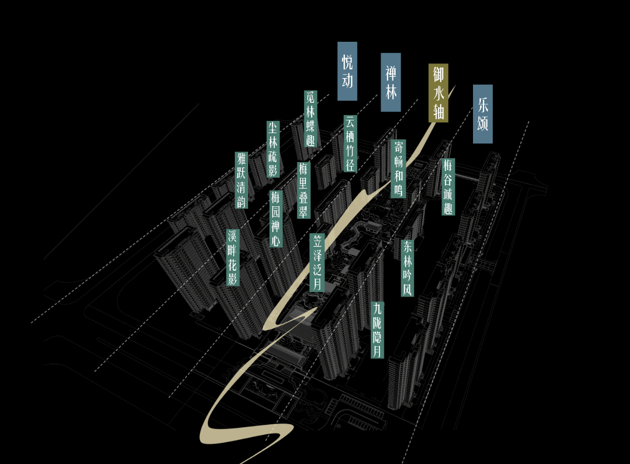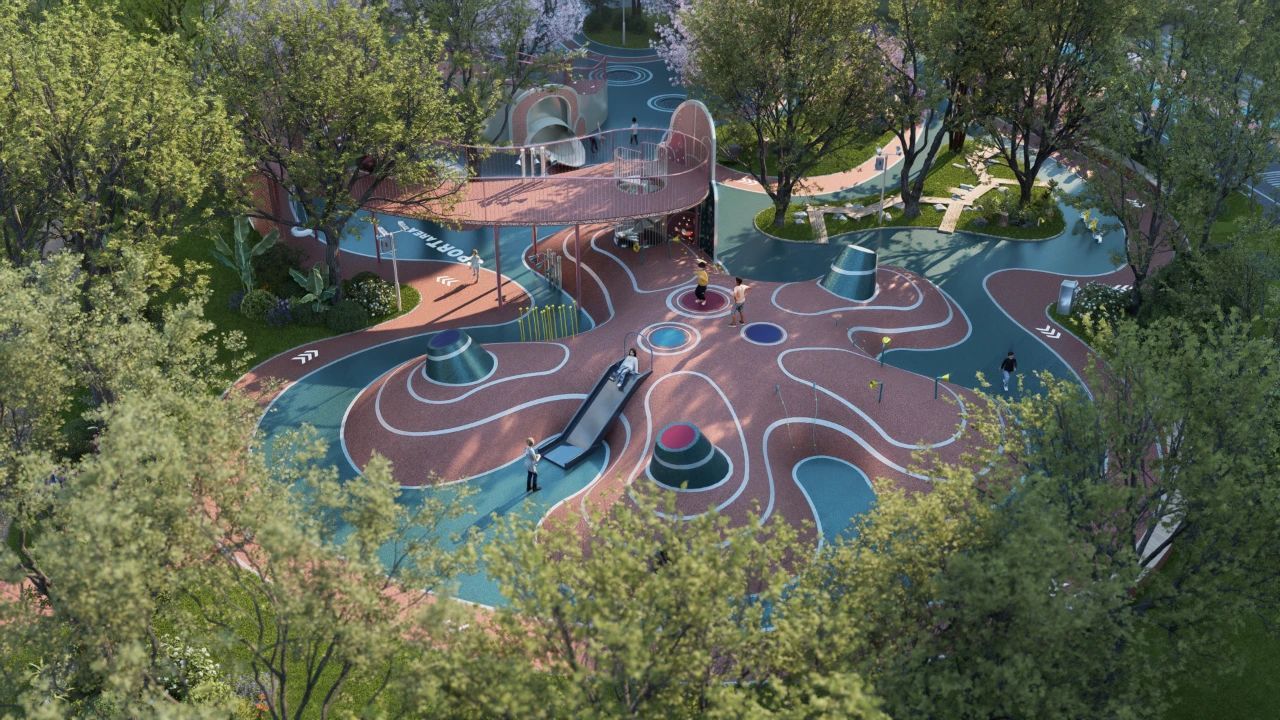 项目精心构建“一轴三院十二境”的公共空间格局,一条景观主轴串联起主题庭院及丰富景观节点,融入约1050平方米的全龄儿童乐园、约590平方米的自然科普课堂及约1030米的林下健身步道等全龄化功能设施。归家动线设计将晋派建筑的庄重与江南园林的雅致完美结合,形成“晋韵吴风”的独特风格。从北方对称布局的入口空间,到融入月洞门、曲水回廊的江南元素,整个动线既保持传统礼序的仪式感,又增添自然灵动的诗意氛围,让归家成为一场穿越南北的文化体验。