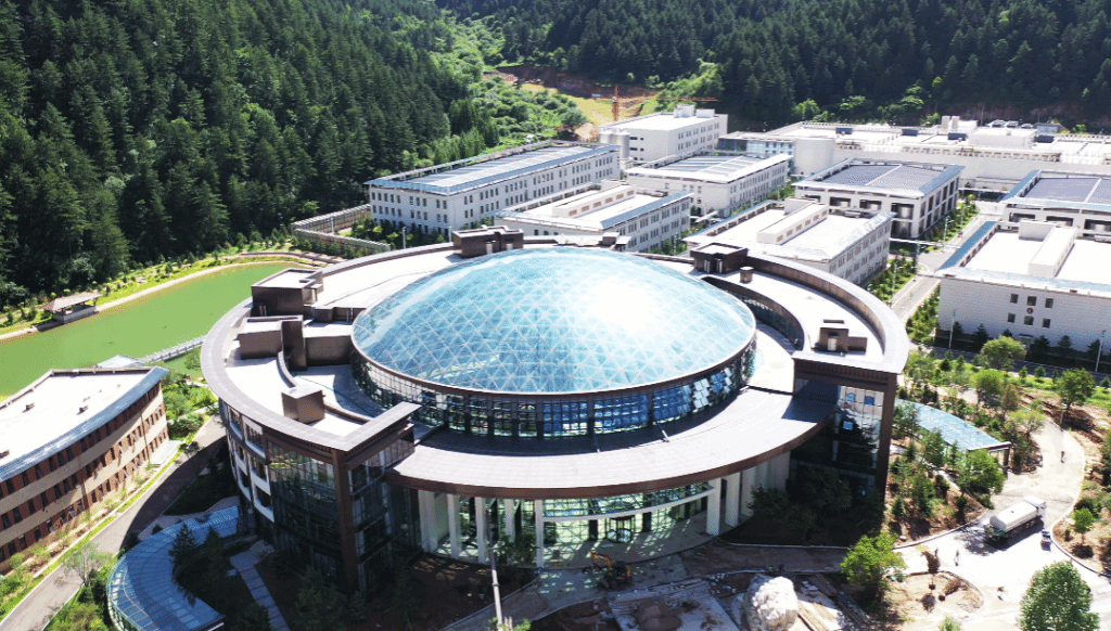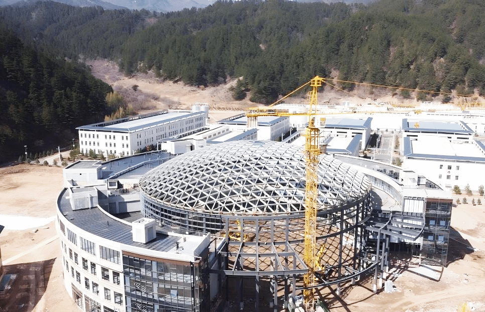 针对现场安装条件,团队创新采用顶升方案将网架顶至屋面标高,该工艺在铝合金单壳结构中属国内首次应用。相关成果《大跨度铝合金球面网壳精益制造及顶升安装关键技术研究》荣获华夏建设科学技术奖,经山西省钢结构协会鉴定,“成果整体达到国际先进水平,铝合金单层球壳顶升安装技术达到国际领先水平。”这顶闪耀山林的精品穹顶,不仅是建筑美学的呈现,更彰显了集团以技术创新“开创未来”的底气。