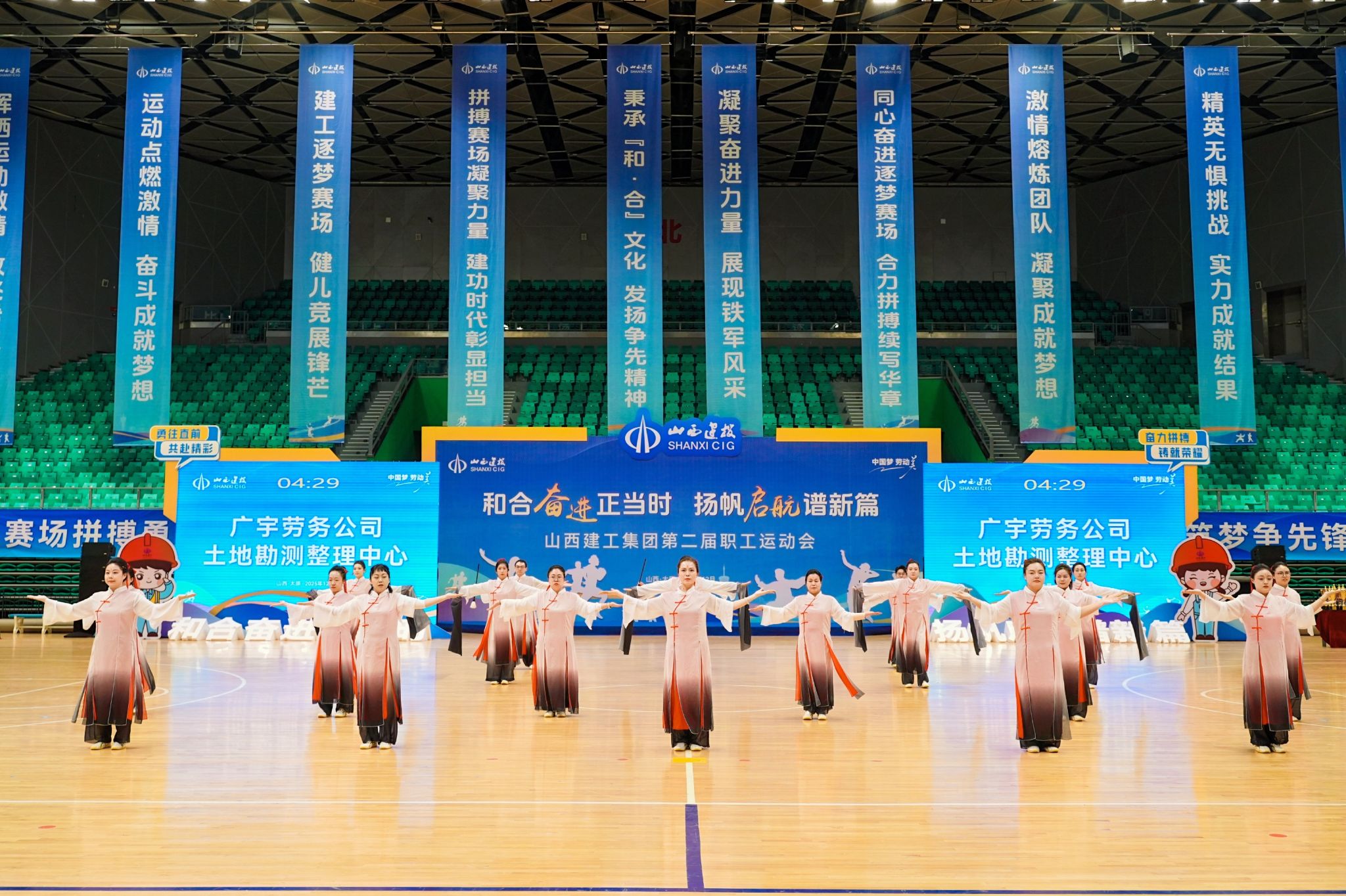 太极拳,太极拳作为特色企业文化的具象表现,成为备受瞩目的焦点竞赛,各代表队服装整齐,随着音乐缓缓起势,动作舒展大方,如行云流水,展现了动静结合、阴阳相济的传统智慧,完美诠释了建工人张弛有度、从容自信的精神境界。
