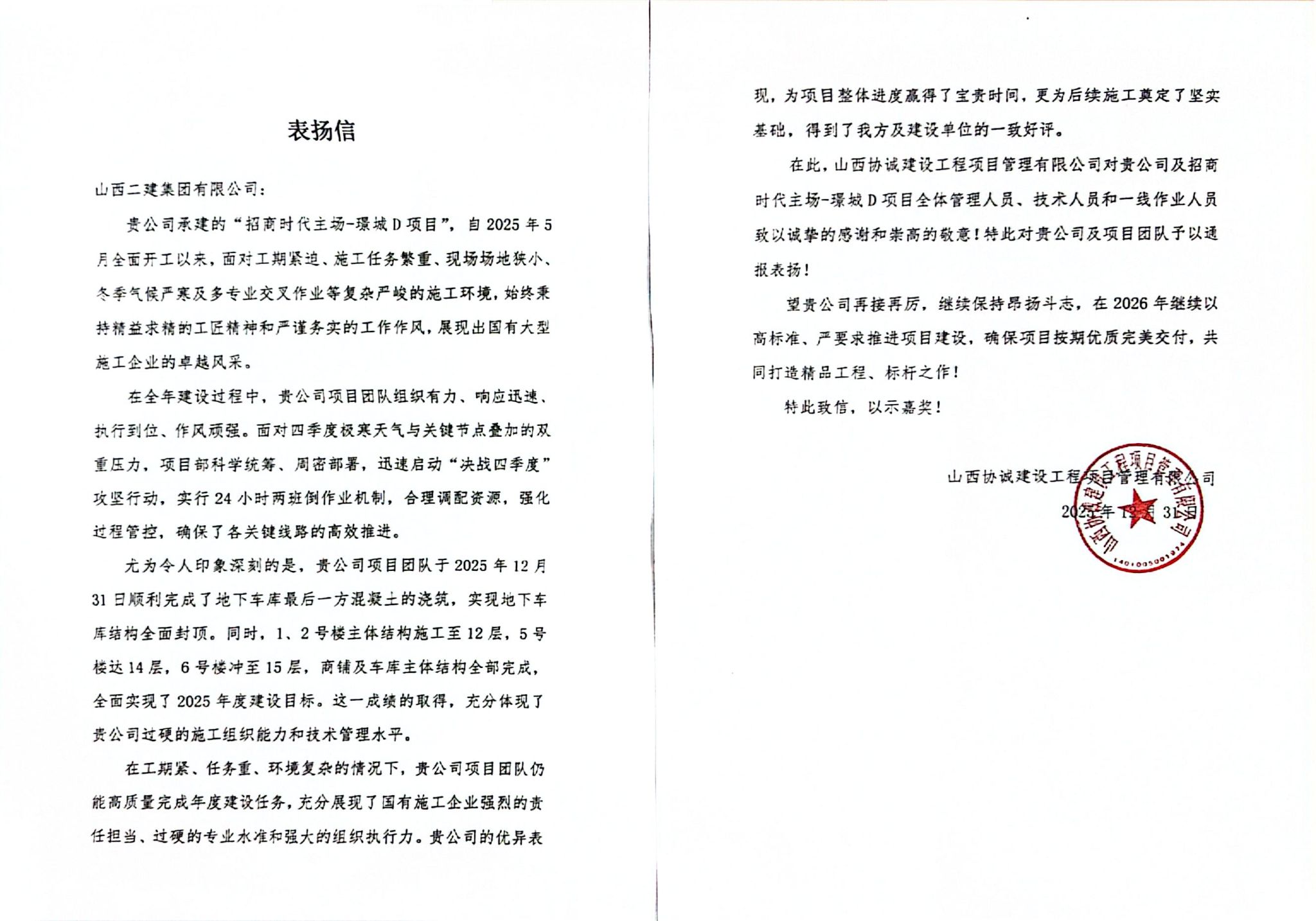 项目团队在工期紧、任务重、环境复杂的情况下,仍能高质量完成年度目标,充分展现了二建集团的责任担当与专业水准。在2025年末,项目的高效推进、规范管理与团队的专业表现,赢得了建设单位与监理单位的高度认可。荣获由山西协诚建设工程项目有限公司签发的《表扬信》。