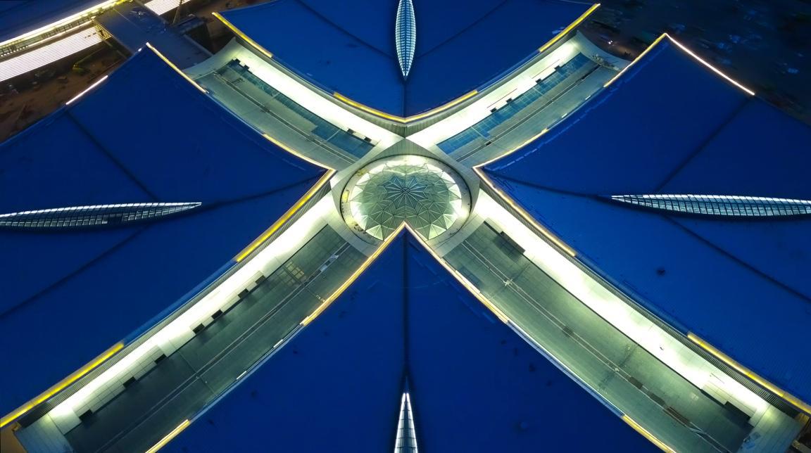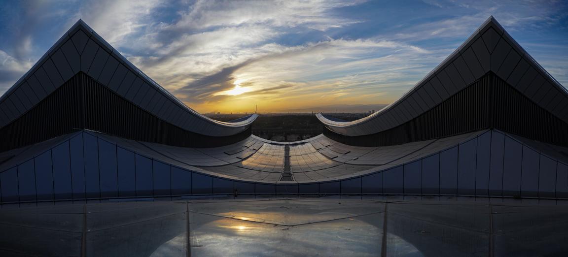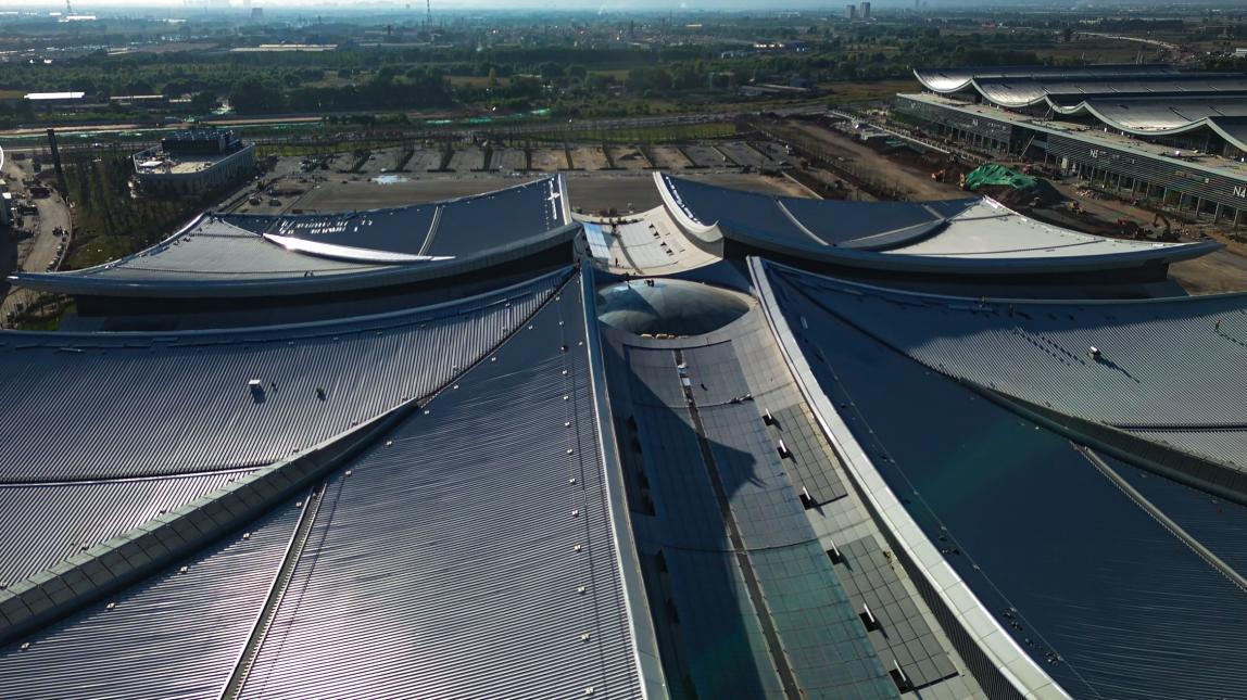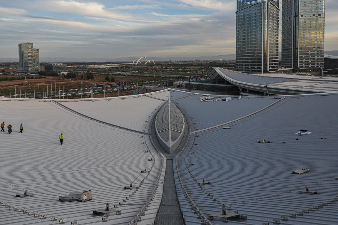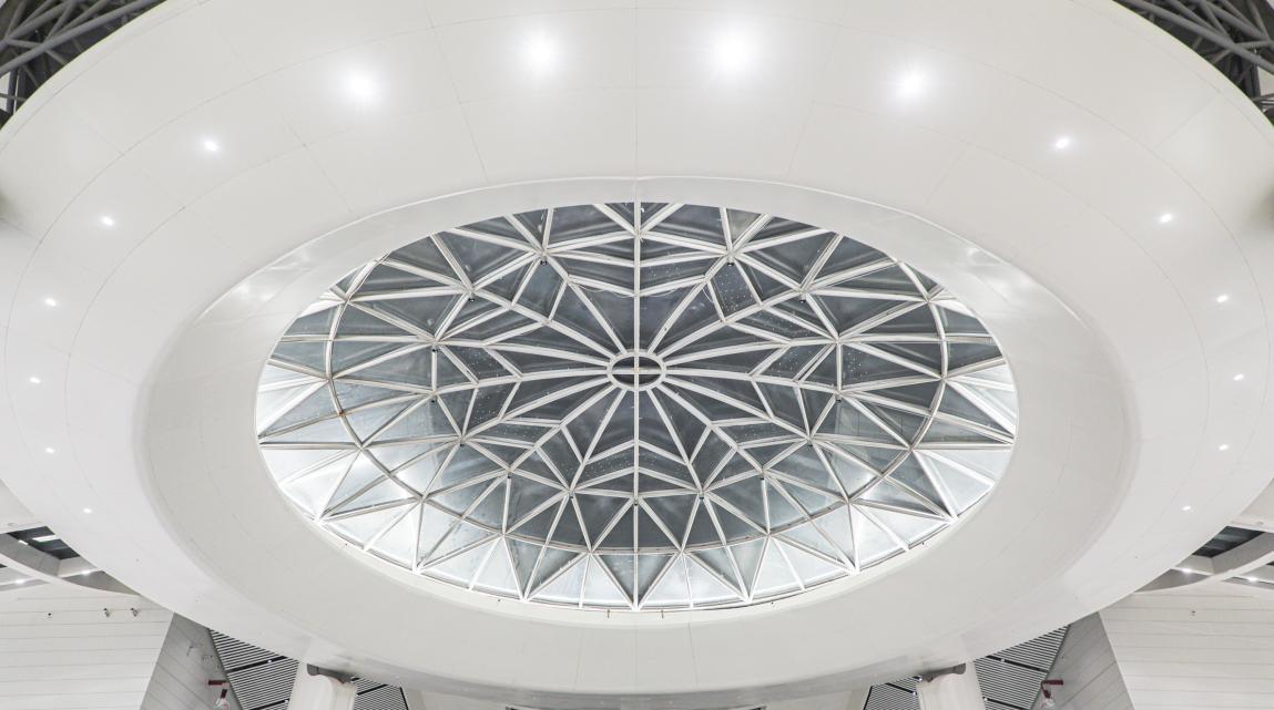 项目屋顶在设计阶段通过防坠落系统、融雪系统、虹吸雨排系统解决了屋面面积大、检修及排水困难等问题。项目技术班组通过建立BIM模型进行节点优化、指导加工下料,以技术保障实现预期效果。施工阶段采用了双曲面镀铝锌钢板金属屋面(不滑移)系统、直立锁边技术,有效提高了金属屋面整体性能,增强了屋面防水和抗风揭能力。十字交通厅及中心穹顶采用三维模拟分割、双曲夹胶玻璃加工、旋转桁架高空吊装、接缝防水等针对性技术和工艺措施,高质高效完成了异形双曲面单元玻璃板块的定制安装,从物理和心理双重层面实现了“凝心聚力”的设计理念。