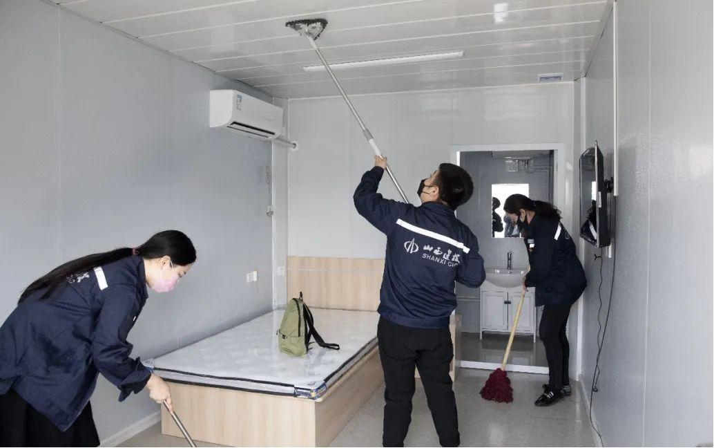 此次主题党日活动共设九个小组,负责方舱隔离点(客运东站区)建设项目的卫生清洁工作。参加活动的党员干部和职工群众自备劳动工具,分工明确、相互协作。大家拿着笤帚、抹布、拖布等工具,对房间里的桌子、椅子、床、床头柜、墙面、门、窗、卫生洁具、地面、楼道、栏杆等进行了认真清扫。党员干部以身作则,在打扫过程中不留死角,认真清洁;职工群众争先恐后,团结协作。劳动中,大家响应防疫号召,全程佩戴口罩,保持安全距离。经过一天辛勤打扫,九个小组共打扫隔离单间630间,项目面貌焕然一新,环境卫生达到了交付使用标准。