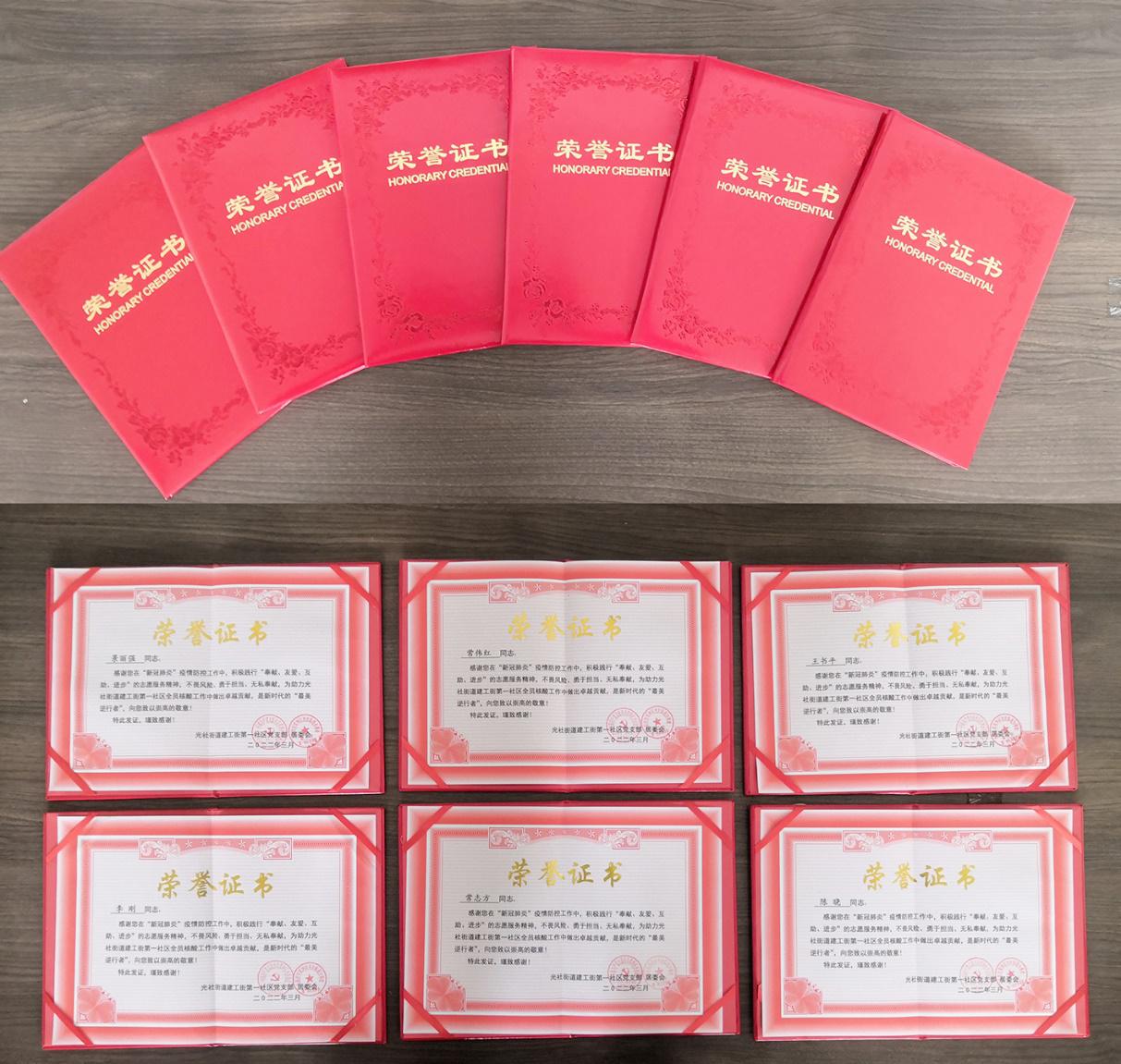 经过几天的艰苦奋斗,尖草坪区疫情得到有效控制,光社街道建工街第一社区对公司支持抗击疫情工作给予充分肯定,并为志愿者颁发了荣誉证书。