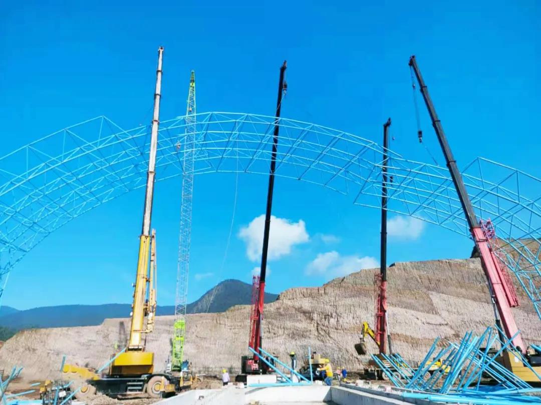 近日,公司承建的印尼金瑞年产260万吨焦化项目焦棚球形网架起步轴吊装拼接成功。