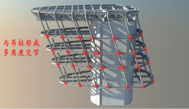 主要建筑终点塔采用钢筋混凝土核心筒+异形悬挂钢结构;媒体中心采用双层悬挑钢结构设计,悬挑长度达建筑宽度的56%,两座建筑间通过端部支座紧紧衔接。异形曲面悬挂式建筑底层架空,无支撑钢柱,建筑外形为曲面、异形,整个结构的荷载由屋面的曲面巨型桁架倾斜73°,外挂14根竖向吊杆承载下部楼层。施工时既要满足工期要求,还需满足异形曲面建筑各节点安装精度要求,同时外立面采用全玻璃幕墙,应二青会场馆的验收要求,工期紧迫,幕墙构件需提前制作,与钢结构安装形成流水段,无后期调整的可能,这就使得整个悬挂式钢结构建筑施工难度增大。