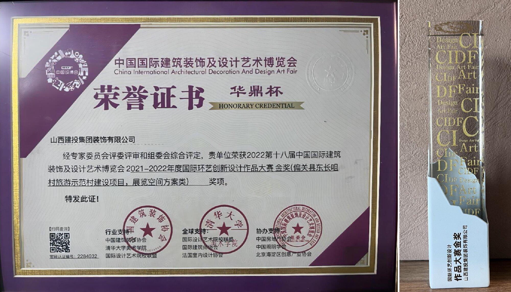 近期,第十八届中国国际建筑装饰及设计艺术博览会在北京雁栖湖国际会展中心召开,会上山西建投装饰公司获得2021-2022年度中国建筑装饰行业最具工匠精神设计机构奖(山西省乡村建设一站式综合服务建设项目)、国际环艺创新设计作品大赛金奖(偏关县东长咀村旅游示范村建设项目,展览空间类)。