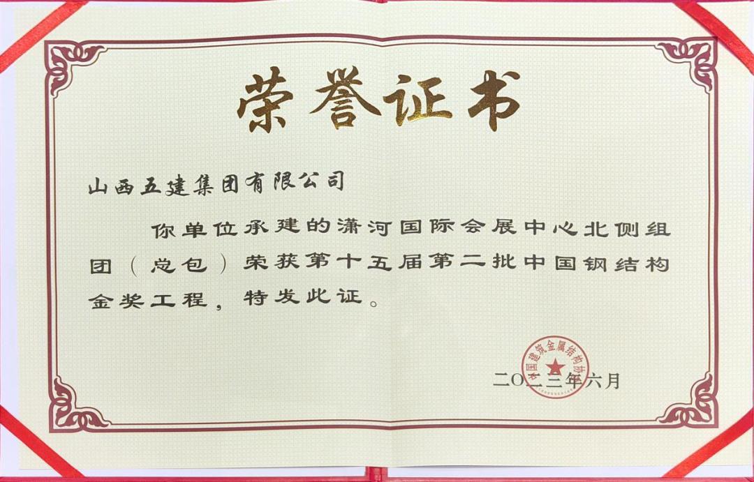 日前,在上海召开的全国建筑钢结构行业大会上,山西建投五建集团承建的潇河国际会展中心北侧组团项目获“中国钢结构金奖”。
