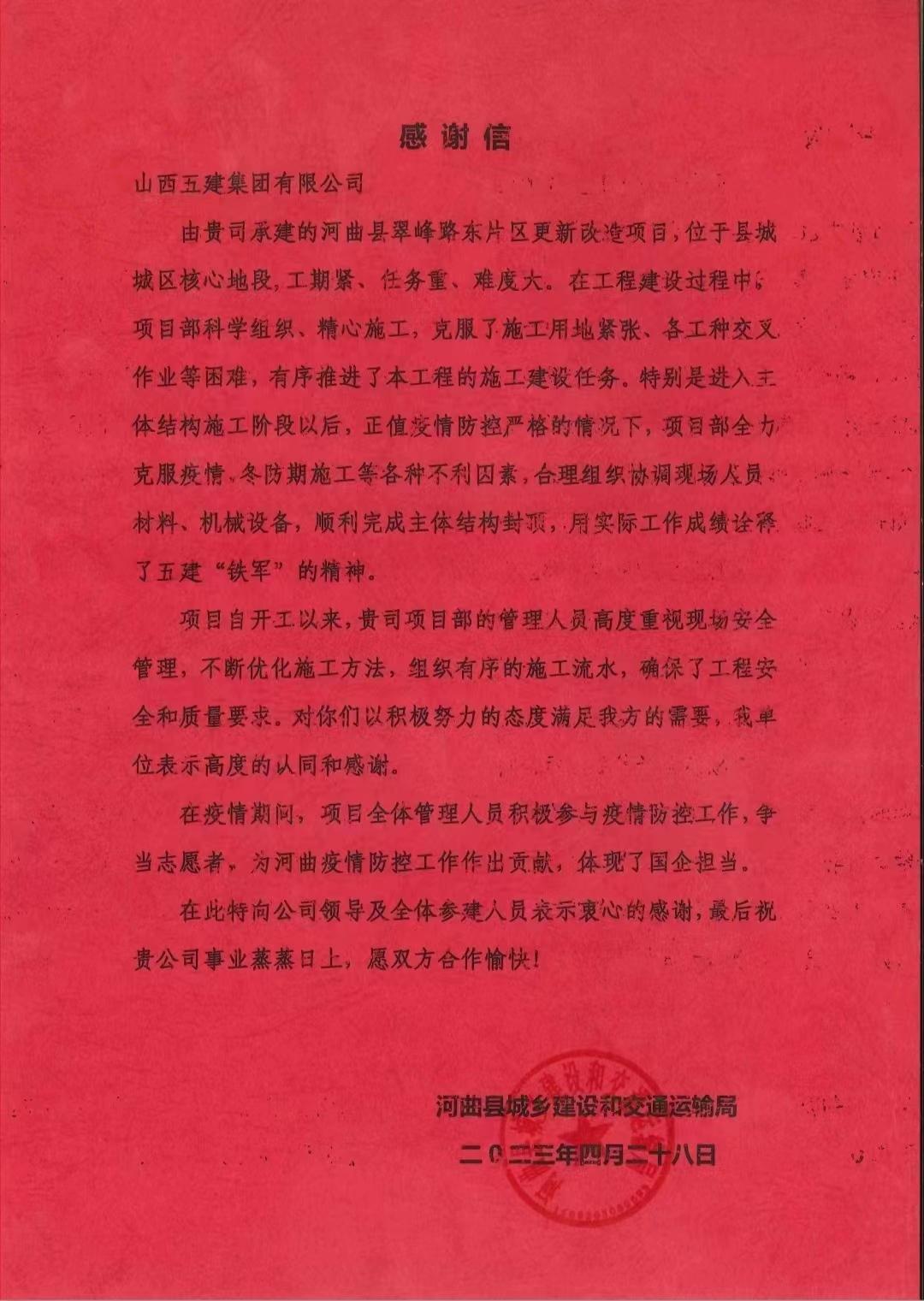 河曲县翠峰路东片区更新改造项目收到来自河曲县城乡建设和交通运输局的感谢信
