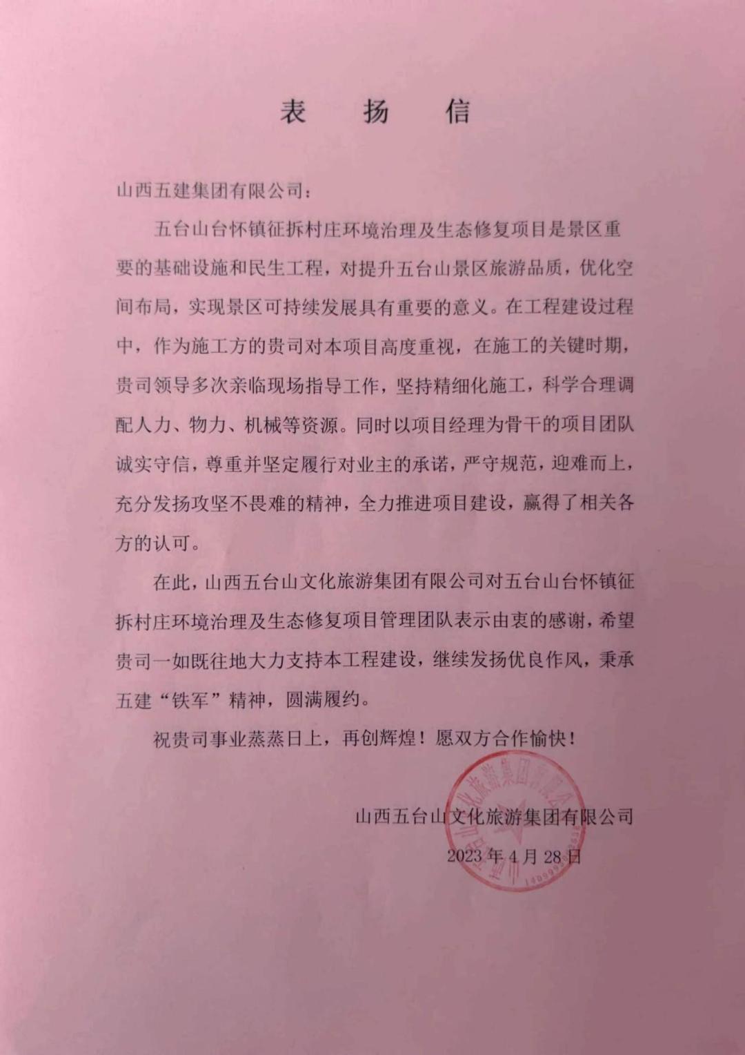 五台山台怀镇征拆村庄环境治理及生态修复项目收到来自山西五台山文化旅游集团有限公司的感谢信,信中对以项目经理为骨干的项目团队诚实守信,坚定履行对业主的承诺,严守规范,迎难而上,充分发扬攻坚不畏难的精神,全力推进项目建设表达了充分肯定与衷心感谢。