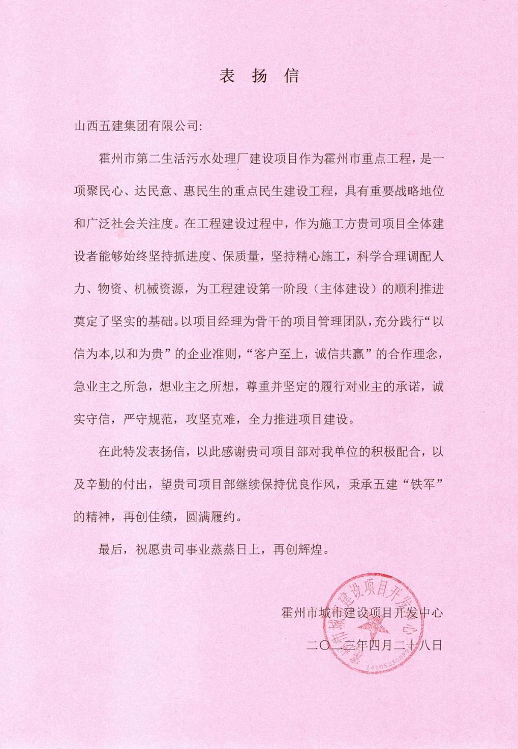霍州市第二污水处理厂建设项目收到来自霍州市城市建设项目开发中心的感谢信,信中对项目团队诚实守信、严守规范、攻坚克难、全力推进项目建设表示感谢。