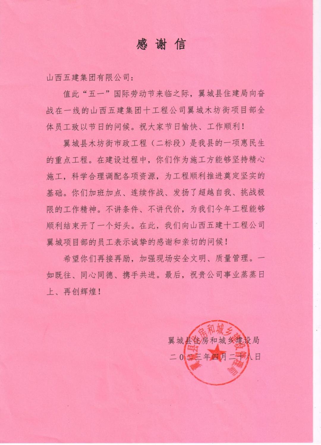 翼城县木坊街市政工程(二标段)项目收到来自翼城县住房和城乡建设局的感谢信,信中对项目团队在施工过程中加班加点、连续作战的工作精神表示肯定,对项目团队不讲条件、不计代价,全力保障工程今年顺利完工表示赞扬。