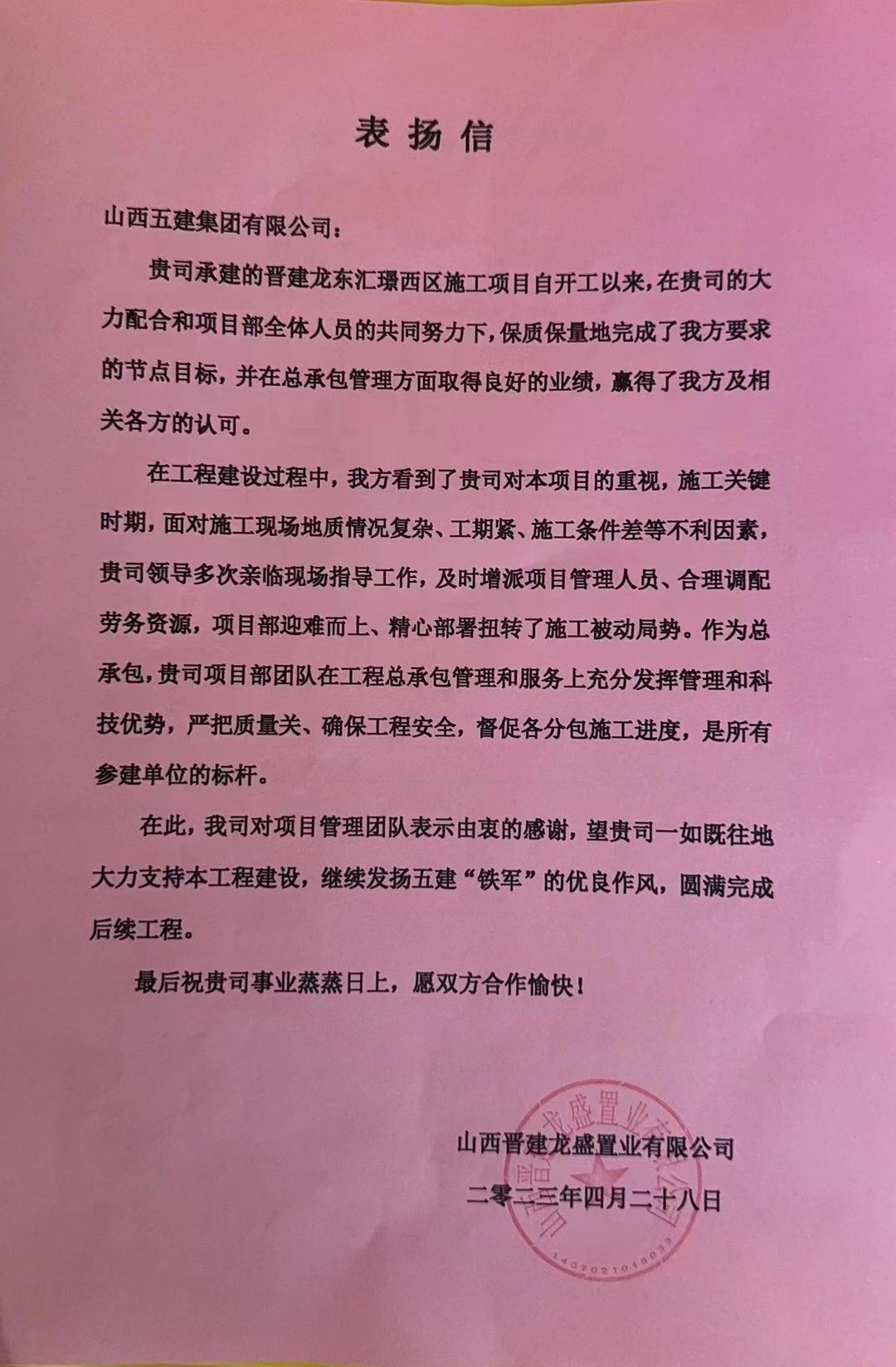 晋建·龙东汇璟(一期)西区施工项目收到来自山西晋建龙盛置业有限公司感谢信,信中对项目团队迎难而上、精心部署,合理调配劳务资源,扭转施工被动局势,保质保量完成节点目标表示衷心感谢。