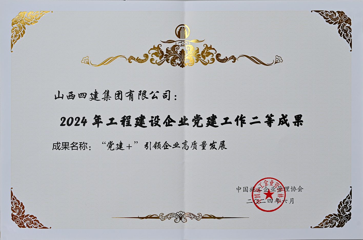 近日,中国施工企业管理协会主办的“2024 年工程建设企业党建工作成果交流会”在延安召开。会上,山西建投四建集团党建成果《“党建+”引领企业高质量发展》荣获工程建设企业党建工作二等成果。