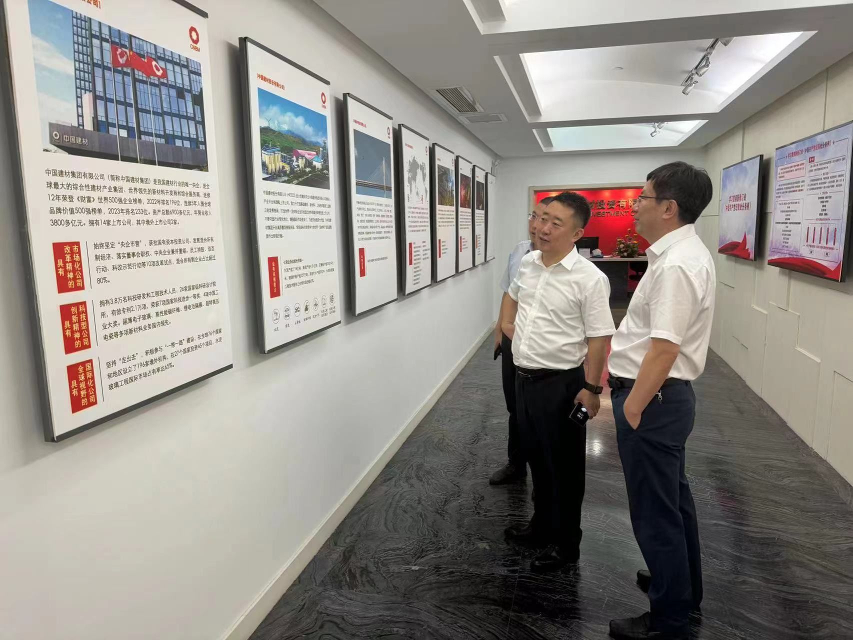 刘建伟一行还参观了中建材投资有限公司企业文化展厅,听取中建材海外经济合作有限公司董事长张欣对中建材投资历史沿革、组织架构、国际化和集采供应链业务战略定位、发展现状、经营业绩、发展布局等情况介绍。