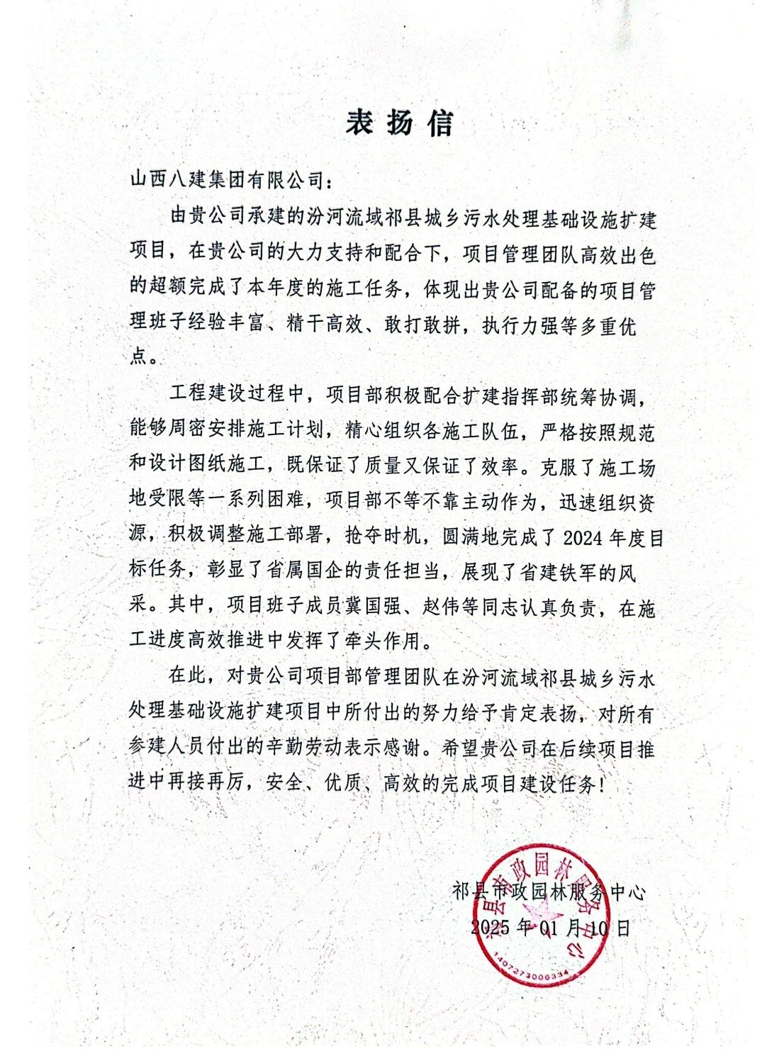 1月10日,山西建投八建集团承建的简子沟城市棚户区改造项目收到阳泉市城际房地产开发有限责任公司的感谢信,汾河流域祁县城乡污水处理基础设施扩建项目收到祁县市政园林服务中心的表扬信。信中对八建集团在项目管理、施工进度、安全文明施工等方面给予高度赞扬。