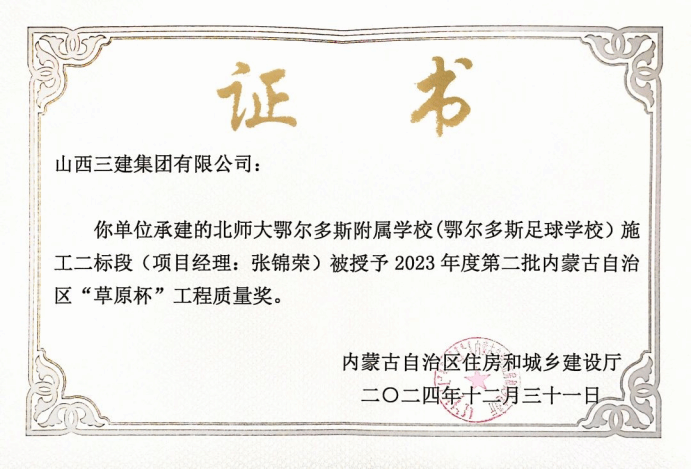 近日,从内蒙古自治区住房和城乡建设厅传来喜讯,山西建投三建集团承建的北师大鄂尔多斯附属学校(鄂尔多斯足球学校)施工二标段,荣获内蒙古自治区“草原杯”工程质量奖。