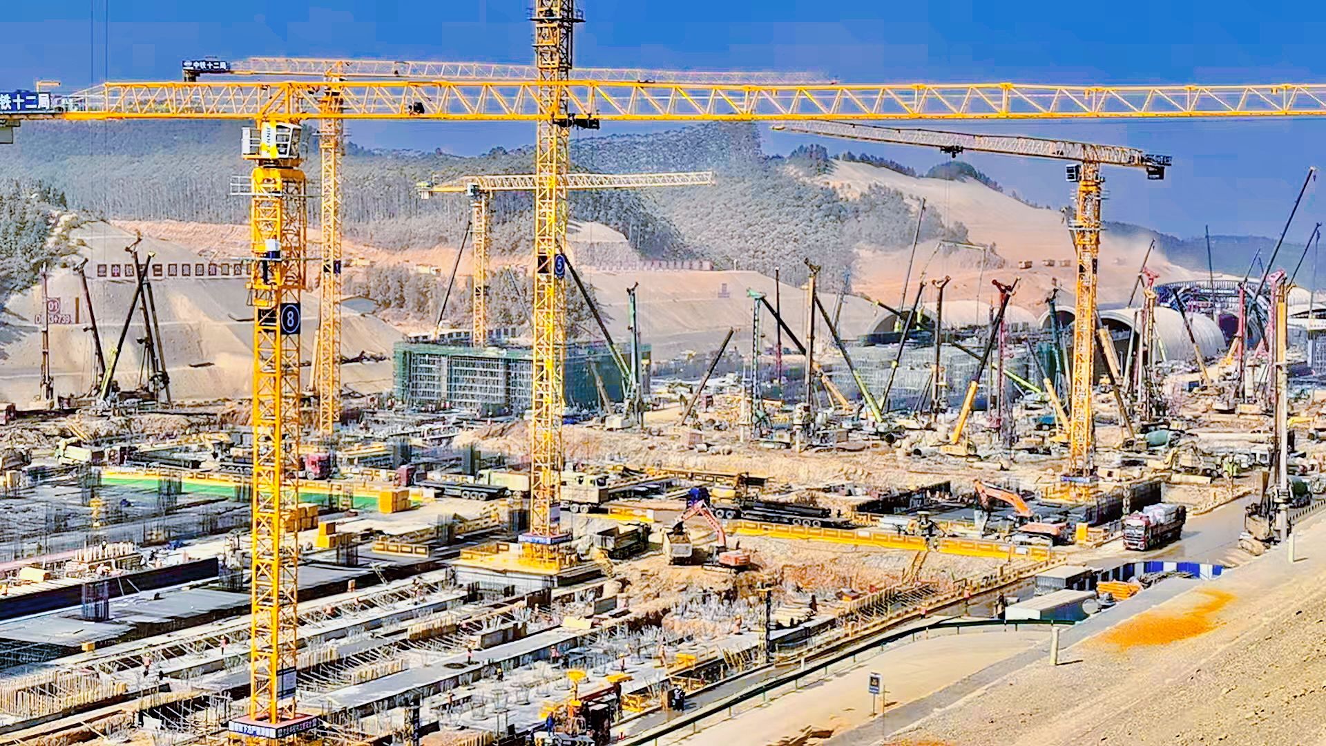 在广州至湛江高速铁路珠三角枢纽机场站前工程项目现场,一台台晋塔塔式起重机正有条不紊地吊装,高效配合项目建设各项施工需求。