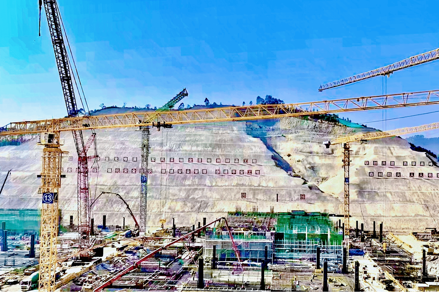 晋塔塔式起重机参建广州至湛江高速铁路珠三角枢纽机场站前工程项目。该项目为明挖暗埋式地下车站,主站房位于地下二层,高铁和轨道交通平行,共6台14线,轨行区结构最大宽度164.8米,长505.5米,车站底板埋深26米。