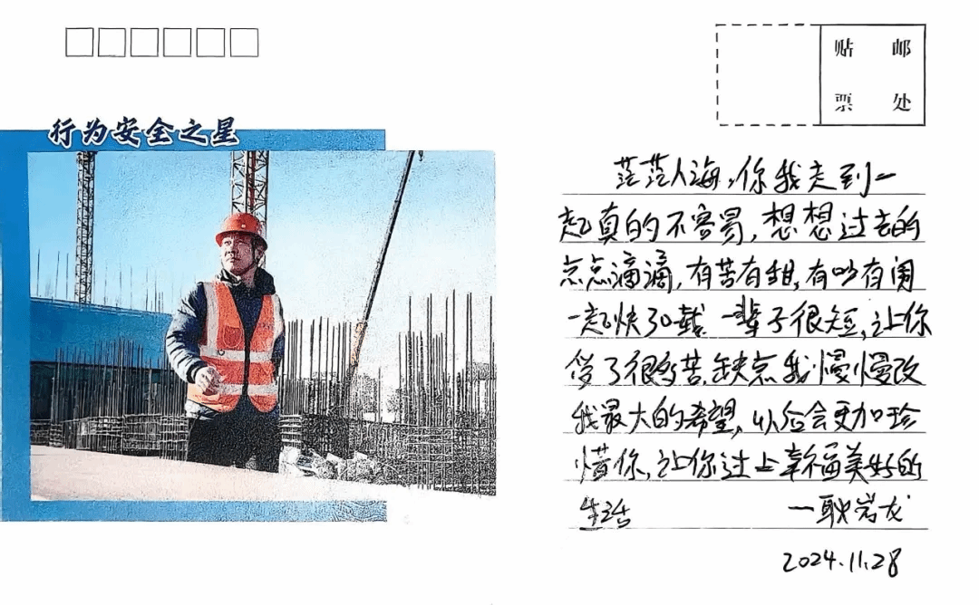 在安全管理方面,党支部创新实施行为安全明信片活动,将工友安全事迹通过明信片传递至家乡,用党组织关怀激发“我要安全”的内生动力。划分党员安全责任区,由党员骨干担任“安全网格长”,包保片区安全巡查、隐患整改、人员教育,建立“网格日志”,每日记录、动态清零隐患;实施“党员身边无违章、无隐患、无事故”承诺践诺,让党员在关键区域、关键工序成为流动的安全哨兵。