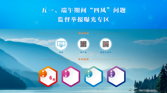 为持续推进正风肃纪,营造风清气正节日氛围,中央纪委国家监委网站推出“五一、端午期间‘四风’问题监督举报曝光专区”,加大典型案例通报曝光力度,持续释放全面从严、一严到底的强烈信号。专区开设“我要举报”窗口,链接中央纪委国家监委统一举报平台,欢迎广大网友通过网站、手机客户端和微信公众号,对节日期间易发的违规吃喝、违规收送礼品礼金、违规使用公车、公款旅游、违规发放津贴补贴或福利等问题进行举报。专区“每周通报”栏目从5月6日起,分4次集中对各地查处的“四风”典型问题点名道姓通报曝光,强化警示震慑,确保节日风清气正。