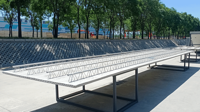 园区可生产预制混凝土柱、叠合梁、夹芯保温外墙板、楼梯、预应力混凝土叠合板等14种PC建筑类构件,具有尺寸精度高、观感质量好、施工安装快、环境污染少等优点。