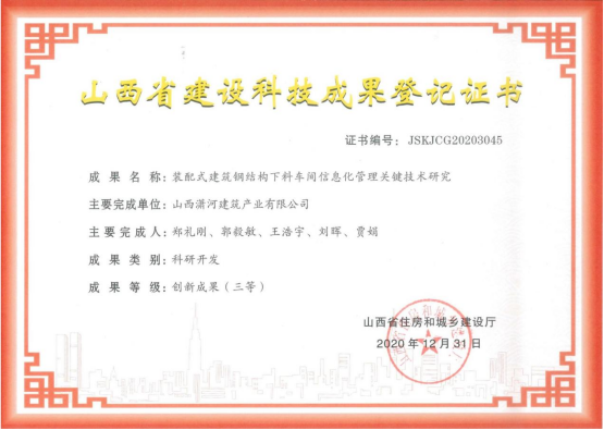 装配式建筑钢结构下料车间信息化管理关键技术研究科技成果登记证书
